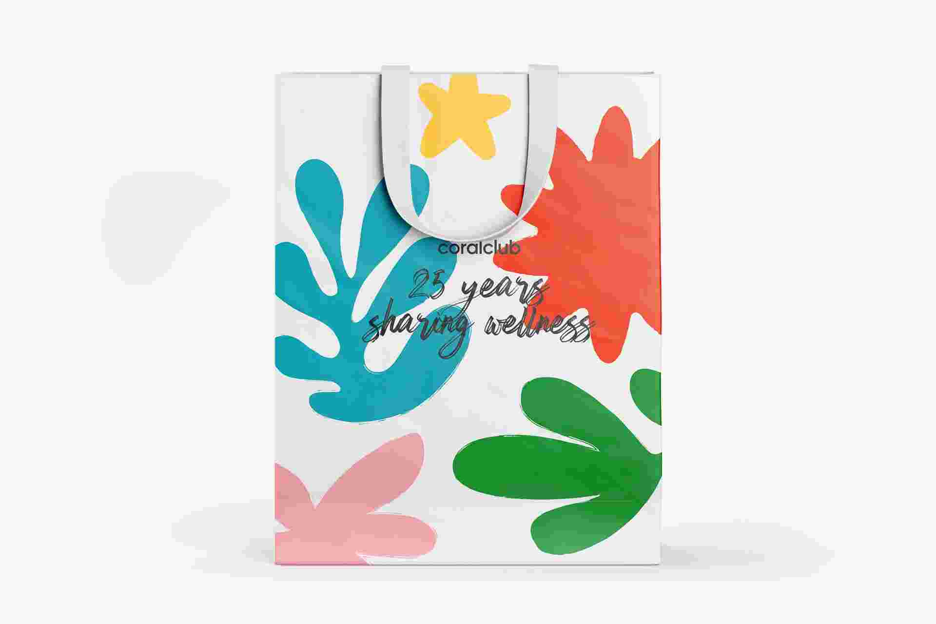 Брендированный подарочный пакет посвящен юбилейному году Coral Club и идеально подходит, чтобы радовать близких подарками для заботы о себе.